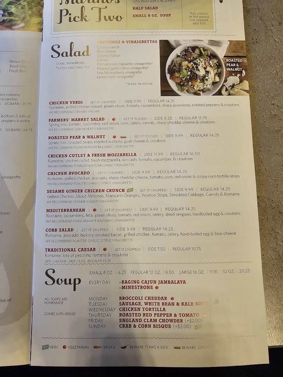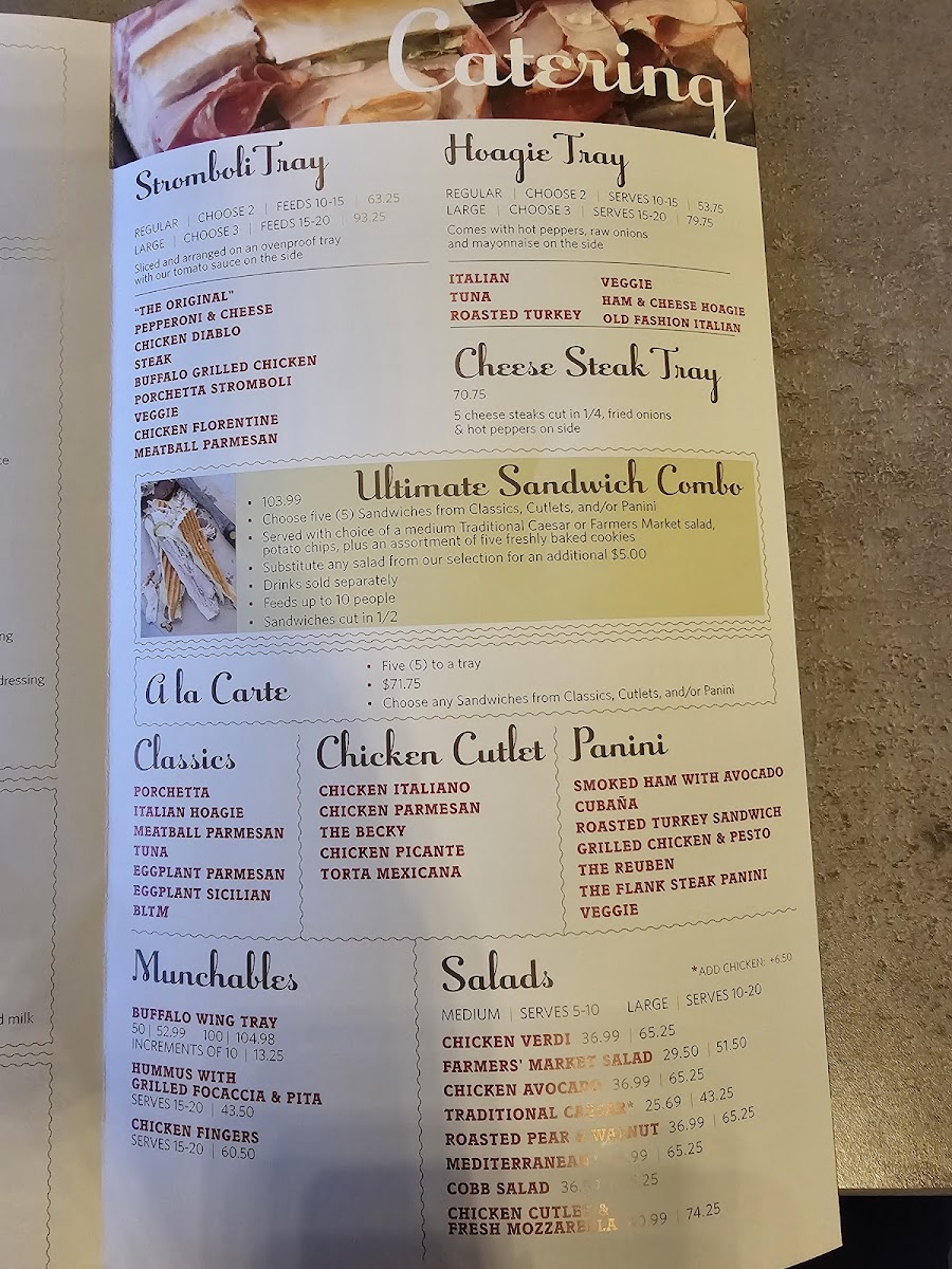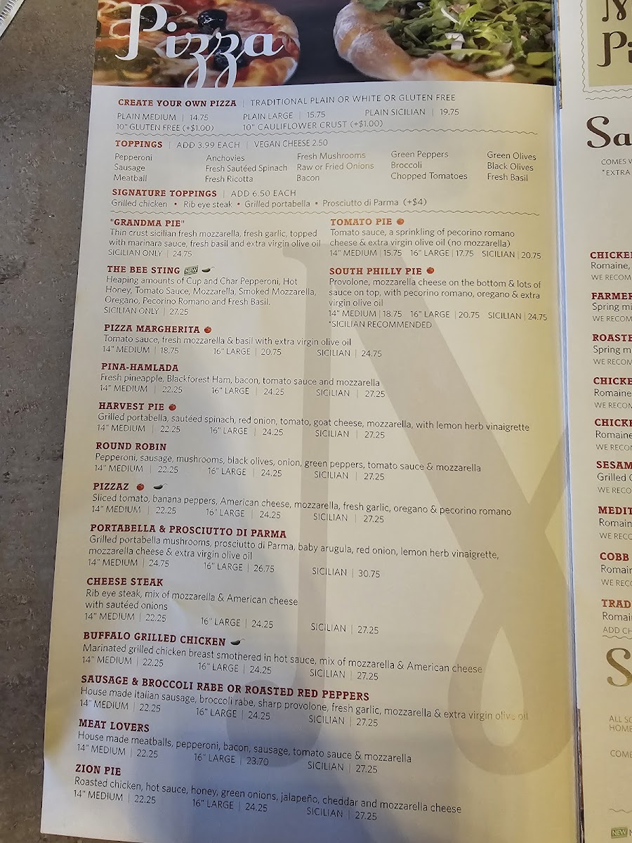 In addition to pizza, the menu features sandwiches and paninis, including items like Chicken Florentine, Cheese Steak Deluxe, and Grilled Chicken Pita with Roasted Pear & Walnut Salad. There are also several salad choices, including Chicken Cutlet Salad and mixed salads that pair well with the sandwiches or as a lighter meal option.